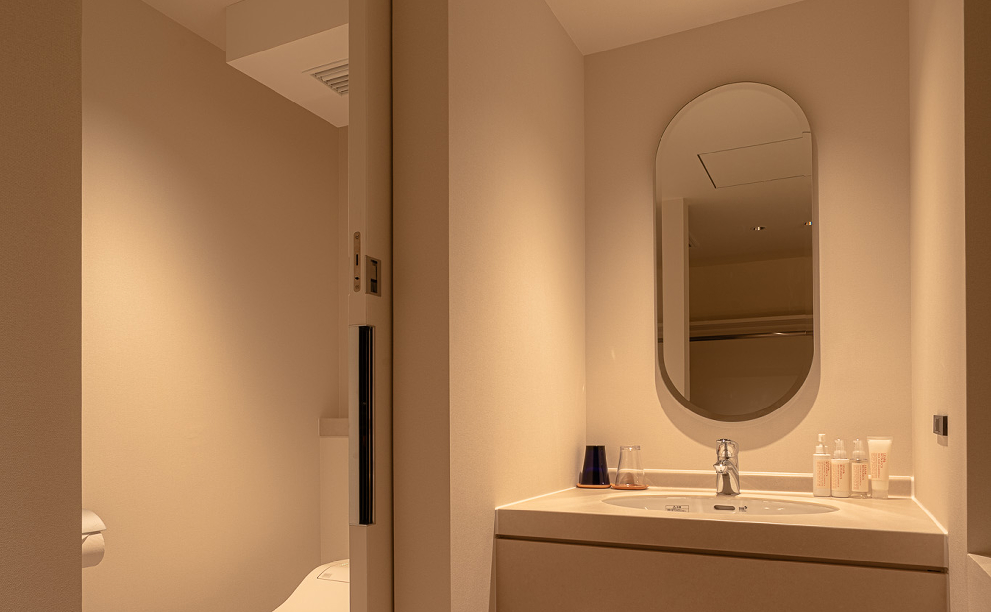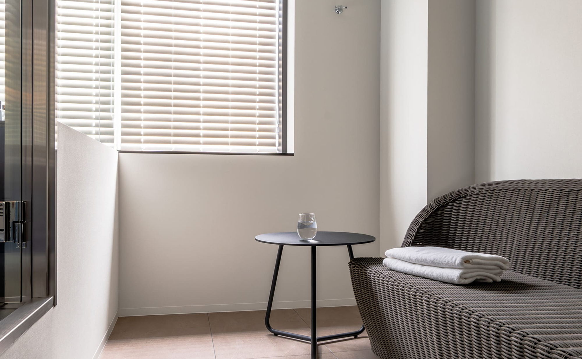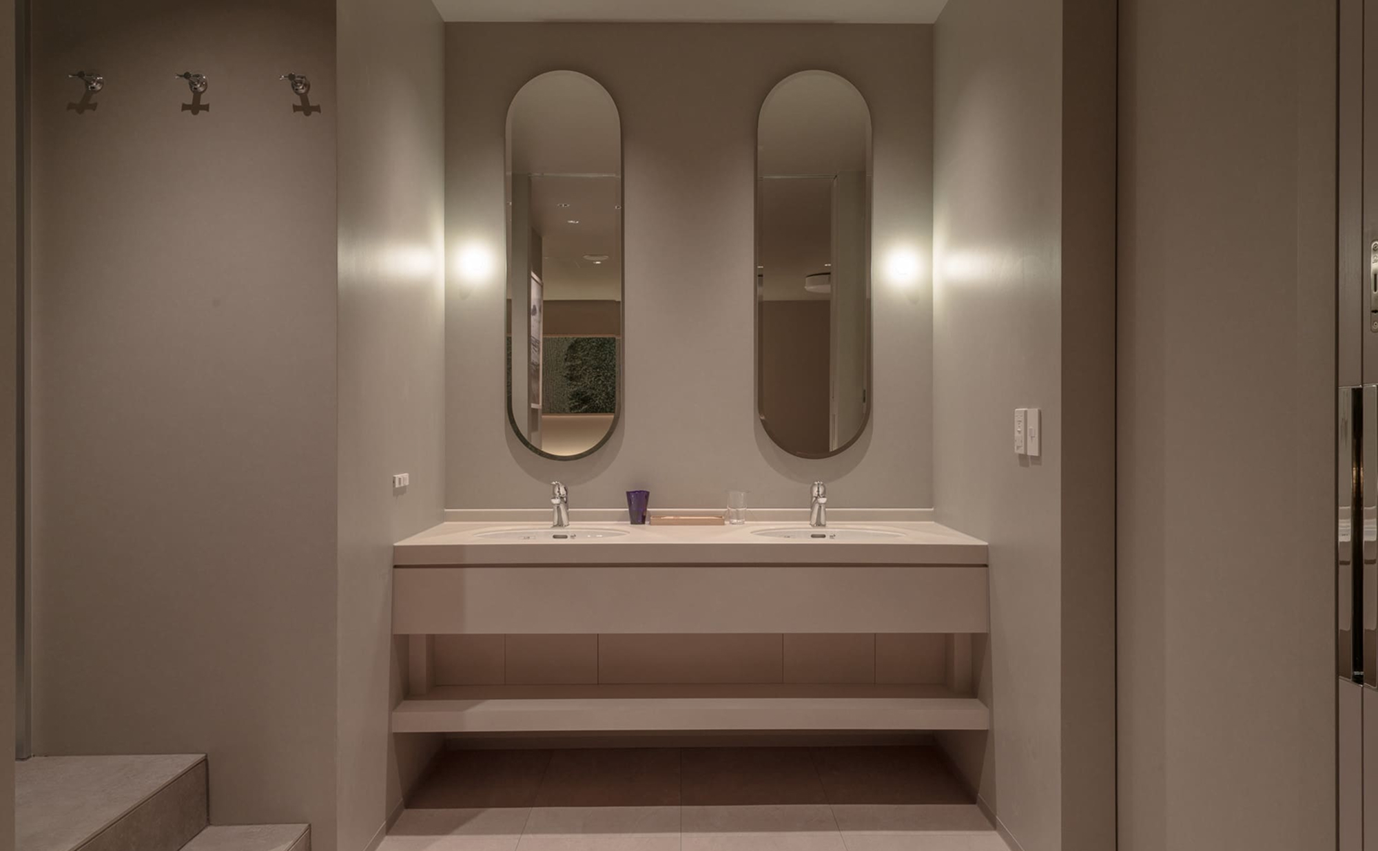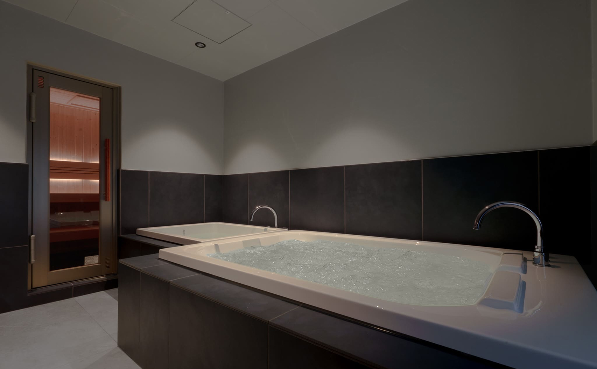 水風呂・温浴を同時に楽しめるダブルバスで温冷交代浴も可能、“完結したととのい動線”を客室内に実現しました。整いスペースは調光次第で、深く心身を整えるひとときも仲間と語らいながら過ごすリラックスタイムも叶えます。
