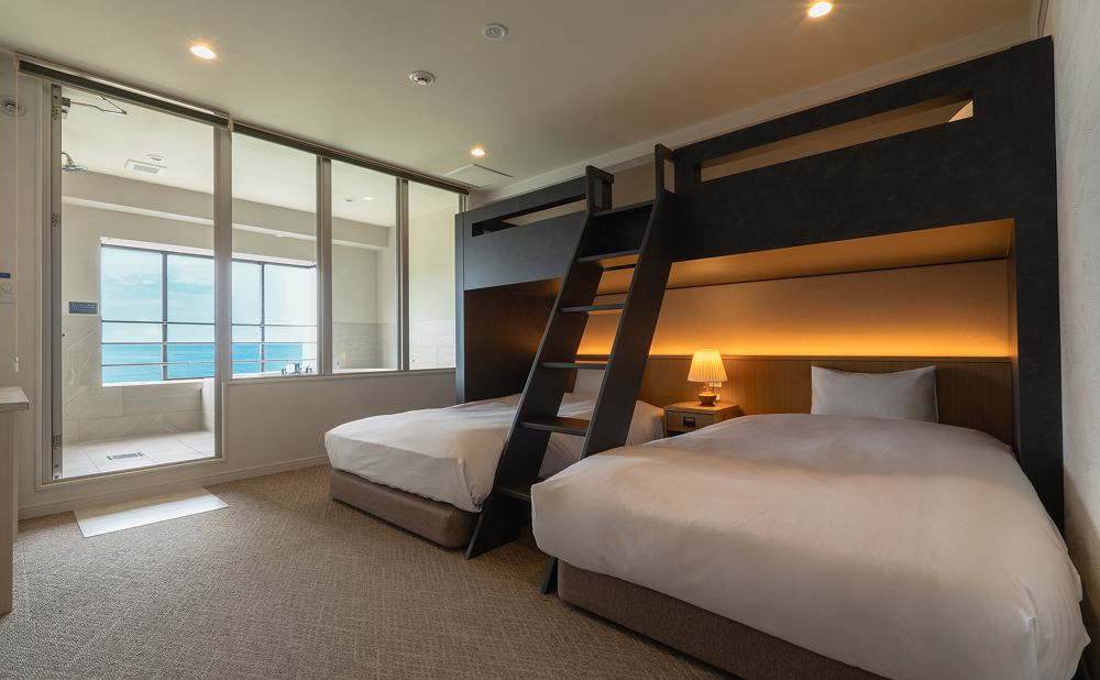サウナ後は海と空に溶け込む絶景ジャグジーで、心身ともにととのう体験を。ツインベッドを備えた2名定員で、カップルやご夫婦におすすめです。広さ:33平米