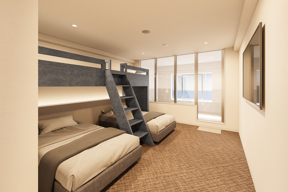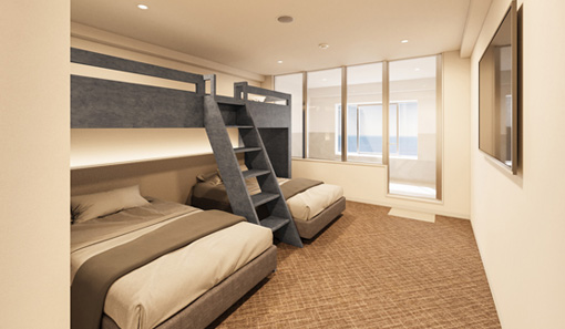 バンクベッドを備え最大5名様まで利用可能な当客室は、 ファミリーやグループ旅行におすすめです。